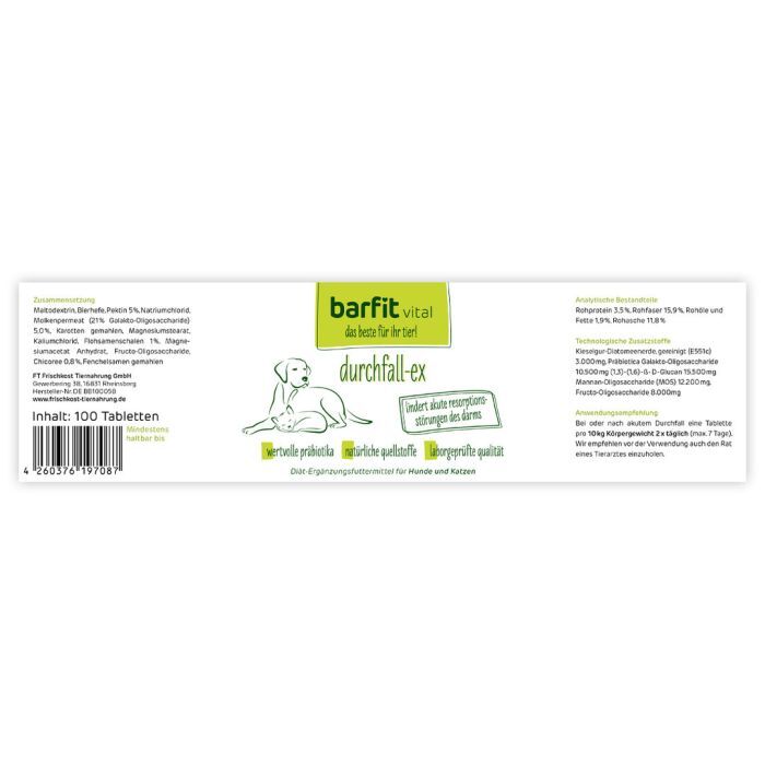 Barfit Vital Durchfall EX wurde entwickelt, um akute Resorptionsstörungen des Darmes auf natürliche Weise schnell zu lindern. Bei oder auch gerade nach Durchfall hilft Barfit Vital Durchfall EX durch die enthaltenen Prebiotika und Quellstoffe Ihrem Tier seine Darmflora zu regenerieren.