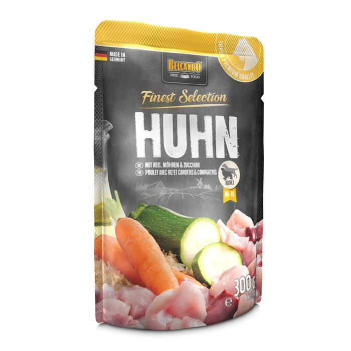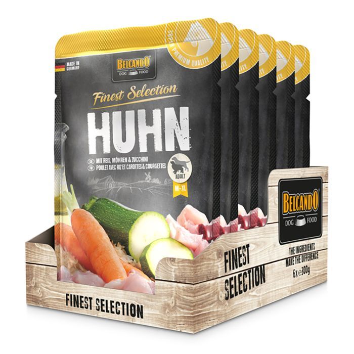 Exzellente Rezepturen in praktischen Einzelportionen. Saftiges Fleisch, mit raffinierten Zutaten verfeinert, wird schonend im Portionsbeutel gegart. Kalt gepresstes Distelöl liefert essentielle ungesättigte Fettsäuren. Außergewöhnlich schmackhaft und bekömmlich eignet sich BELCANDO® Finest Selection hervorragend für sensible oder wählerische Hunde.